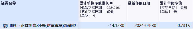 截至4月30日,厦门银行旗下正鑫创赢34号(财富尊享)净值型理财产品在今年前4月跌幅为14.12%。对于下跌原因,厦门银行客服向中国经济网解释,“主要受市场波动影响”。