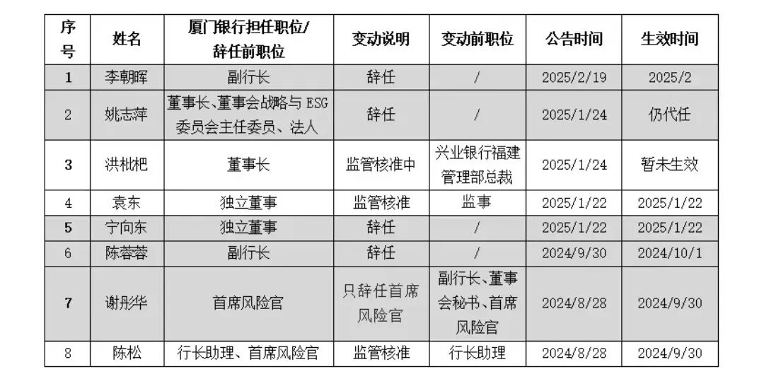 在姚志萍李朝晖辞任前的半年时间里,厦门银行还有多名董监高人员职务被调整,包括与姚志萍同一个月离职的独立董事宁向东,2024年9月因为到龄退休的副行长陈蓉蓉,2024年8月辞任首席风险官、仍保留副行长和董秘职务的谢彤华,由原来的行长助理陈松同时兼任首席风险官。