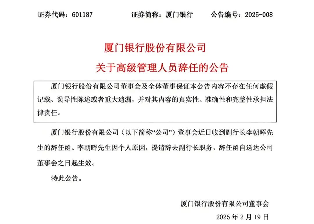厦门银行2月19日公告李朝晖辞职。李朝晖在厦门银行任职时间超过20年,2011年担任副行长时只有36岁,到辞职前担任副行长的时间有13年。媒体注意到,此前厦门银行董监高辞任,厦门银行都会对离任者的贡献表示感谢,李朝晖却是个例外。在关于李朝晖的辞任公告中,没有出现“贡献”和“感谢”之类的字眼。