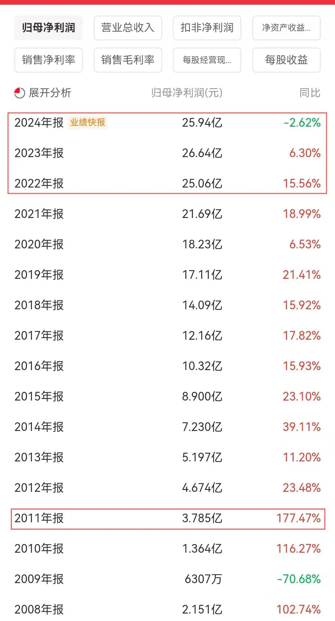 然而从2022年到2024年,营收和净利润开始不断下滑。2022年营收将近59亿元,增速10.9%;2023年下降到56亿元,下滑了将近5%;2024年前三季继续下降到42亿元,下滑了3.07%。而同一时间段的净利润也从2022年增长16%,到2024年出现了自2010年以来的第一次下降,预计下滑2.62%。