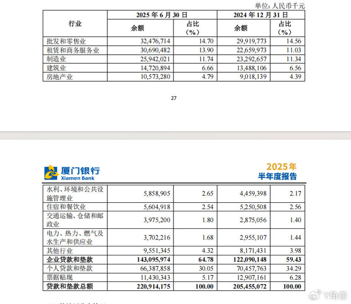将厦门银行2024年半年报和2025年半年报的新增贷款主要投放行业进行对比,可以发现一个重要的差异,就是那些高风险高溢价的行业,也有机会获得新增贷款。