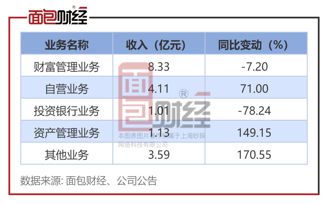 但需注意的是,2023年上半年公司营收占比最大的财富管理业务收入较去年同期有所下降,半年报显示,公司财富管理业务收入为8.33亿元,同比下降7.2%。另外,同期,投资银行业务收入1.01亿元,同比下降78.24%,下降幅度较大。