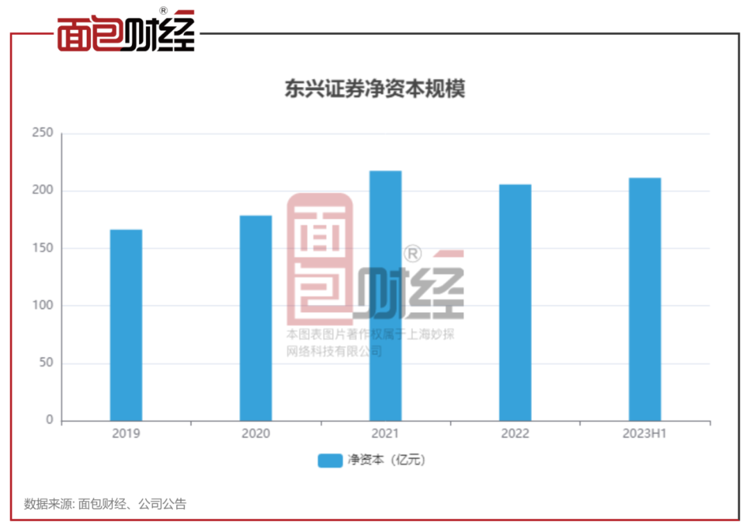 2023年6月末,东兴证券净资本规模为211.24亿元,较2022年末增加5.66亿元,微增2.75%。