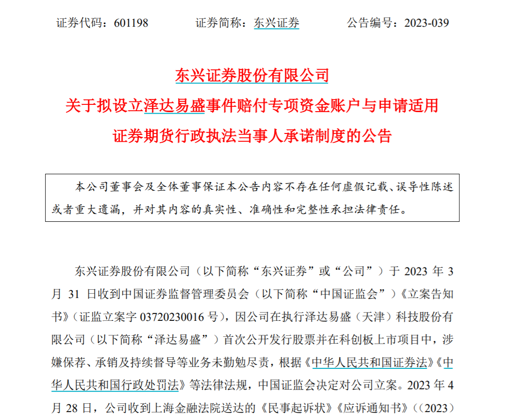 根据公告,东兴证券将申请适用当事人承诺制度。据业内人士分析,通过在法院主导下借助司法调解手段,中介机构先行赔付投资者损失,有利于高效化解纠纷,妥善保护投资者合法权益,减少泽达易盛欺诈上市的损害和不良影响,如效果良好并得到监管部门的认可,则有望按照《证券期货行政执法当事人承诺制度实施办法》的规定终止案件调查及处罚。各方也将迎来一个较为圆满的结果。