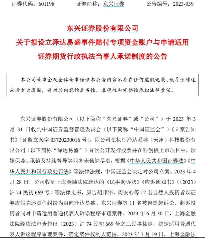 公告显示,因在执行泽达易盛(天津)科技股份有限公司首次公开发行股票并在科创板上市项目中,涉嫌保荐、承销及持续督导等业务未勤勉尽责,东兴证券于2023年9月21日召开董事会会议,审议通过《关于拟设立泽达易盛事件赔付专项资金账户与申请适用证券期货行政执法当事人承诺制度的议案》,同意公司与其他中介机构及相关当事方共同出资设立泽达易盛事件赔付专项资金账户,通过司法调解等高效方式赔付适格投资者的投资损失,并向中国证监会申请适用证券期货行政执法当事人承诺制度。