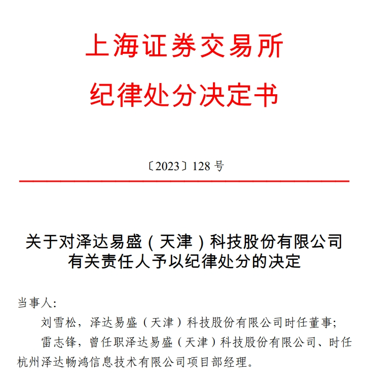 因此,上交所对泽达易盛时任董事刘雪松,曾任职泽达易盛、时任杭州畅鸿项目部经理雷志锋予以公开谴责,并公开认定刘雪松5年不适合担任上市公司董事、监事、高级管理人员。