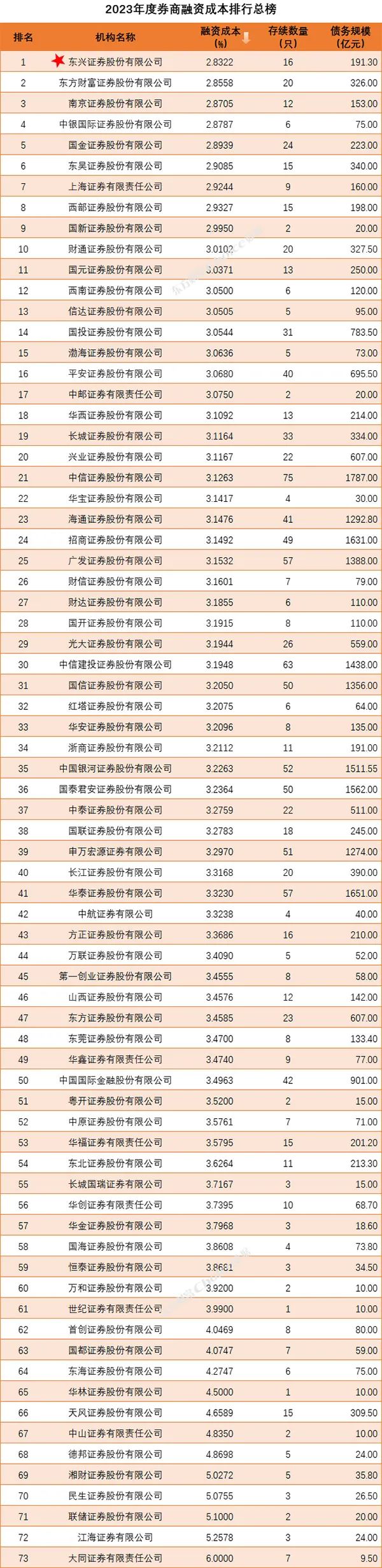 2023年12月31日,东方财富金融数据平台对2023年度证券公司发债融资情况进行梳理统计。截至2023年末,国内证券公司累计发行债券786只,同比增长37.89%,发行金额合计14,996亿,同比增长35.13%,其中中国东方旗下东兴证券凭借良好的资信水平与融资能力,以2.83%的融资利率荣膺行业第一,成为2023年度发债融资成本最低券商。该项成绩的取得,充分展现了东兴证券作为境内首家资产管理公司系上市证券公司,在融资定价、融资销售等方面的专业优势。