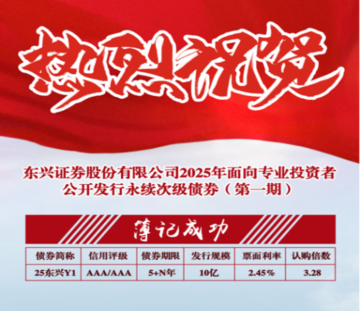 10月21日,东兴证券成功在上海证券交易所簿记发行2025年第一期永续次级债券,发行规模10亿元,期限5+N年,票面利率2.45%。本次为公司首期发行永续次级债券,在公司领导的大力支持下,公司上下通力协作,通过细致充分的发行准备与路演推介,获得了投资者的踊跃支持,全场认购倍数达3.28倍,发行利率具备明显优势,充分体现了市场对公司发展前景的高度认可。