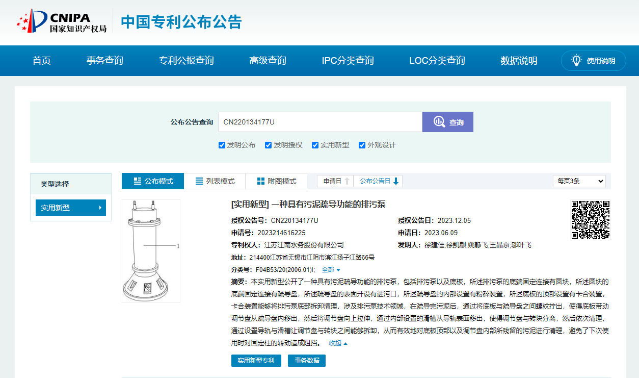 近日,国家知识产权局网站专利公告显示,江苏江南水务股份有限公司取得一项名为“一种具有污泥疏导功能的排污泵”专利,授权公告号CN220134177U,申请日期为2023年6月。
