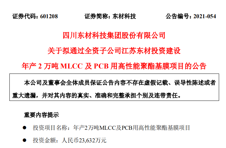 6月4号,东材科技发布公告表示,拟通过全资子公司江苏东材投资建设“年产2万吨 MLCC及PCB用高性能聚酯基膜项目”。本次项目定位于生产MLCC及PCB用高性能聚酯基膜,主要包括MLCC离型膜基膜、高端抗蚀干膜基膜等。