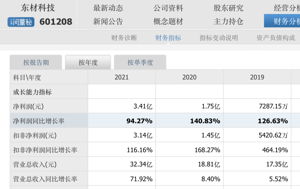 连续三年高增长。东材科技(601208.SH)的年报数据显示,2021年公司营业收入32.34亿元,增长率71.92%,净利润3.41亿元,增幅94.27%,基本每股收益0.4元。而且看往年,2019年东材科技的净利润同比增长率126.63%,2020年为140.83%,已是连续3年高增长。
