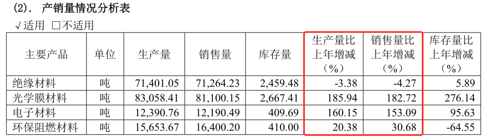分产品来看,东材科技算是全面开花,其绝缘材料营业收入增幅37.14%,光学膜材料业务增长134.84%,电子材料营业收入增幅165.09%,环保阻燃材料增长43.69%。产销量的话,2021年除了绝缘材料,其他均大增。