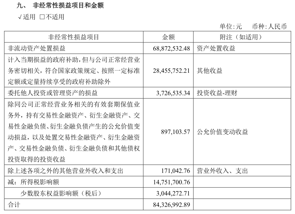 从数据看,报告期内东材科技非经常性损益较大,合计8432.7万元,这其中额度较大的是非流动资产处置的损益,达6887.25万元。