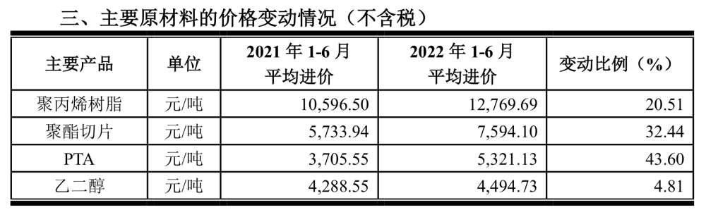 需要指出的是,2022年1-6月东材科技营业成本达14.1亿元,同比增幅为18.36%,这个幅度比营业收入的增幅还大。这是因为主要原材料的涨价所致,包括聚酯切片、聚丙烯切片、PTA等大宗化工材料,而这主要是受全球宏观经济形势和石油价格波动的影响。这其中,PTA的增幅达到43.6%,聚酯切片的价格涨了32.44%,聚丙烯树脂涨幅20.51%。