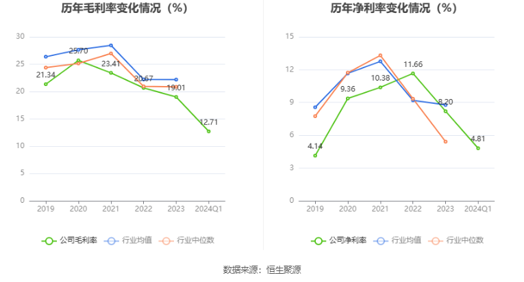 2024年一季度,公司毛利率为12.71%,同比下降8.87个百分点,环比下降5.68个百分点;净利率为4.81%,较上年同期下降3.47个百分点,较上一季度上升3.4个百分点。