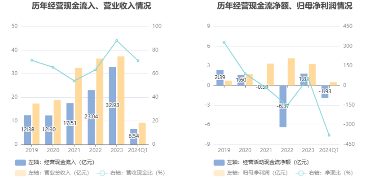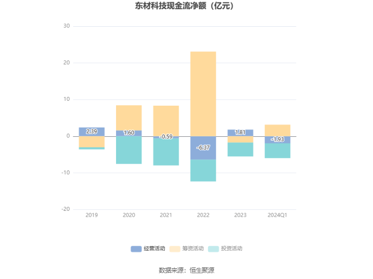 2024年第一季度,公司经营活动现金流净额为-1.93亿元,同比增加7494.73万元;筹资活动现金流净额3.16亿元,同比减少1.09亿元;投资活动现金流净额-4.04亿元,上年同期为-6512.05万元。