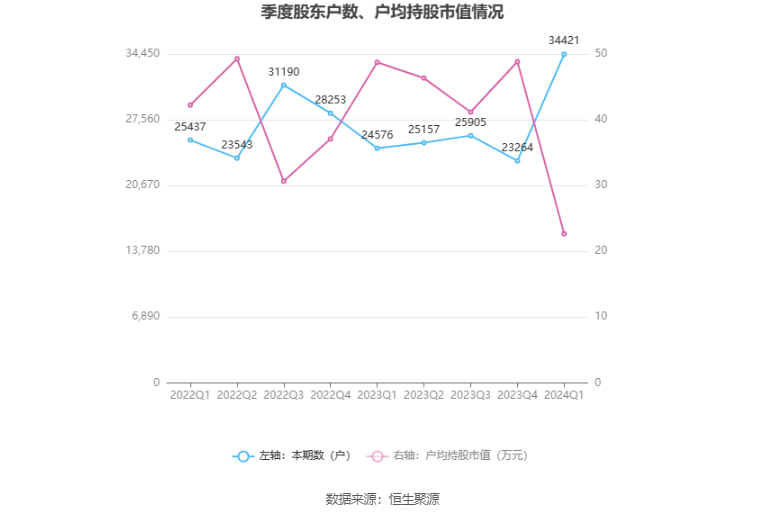 筹码集中度方面,截至2024年一季度末,公司股东总户数为3.44万户,较上年末增长了1.12万户,增幅47.96%;户均持股市值由上年末的48.84万元下降至22.66万元,降幅为53.60%。