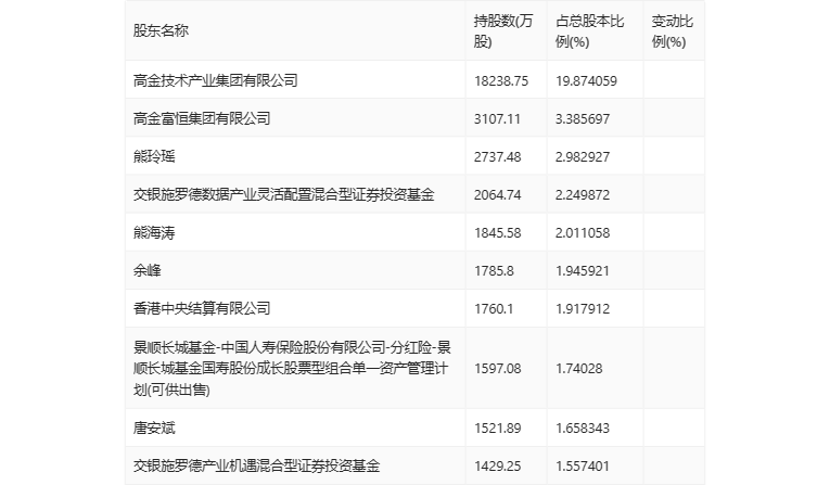 一季报显示,2024年一季度末公司十大流通股东中,新进股东为交银施罗德产业机遇混合型证券投资基金,取代了上年末的中欧优质企业混合型证券投资基金。在具体持股比例上,高金富恒集团有限公司、交银施罗德数据产业灵活配置混合型证券投资基金、余峰、香港中央结算有限公司、景顺长城基金-中国人寿保险股份有限公司-分红险-景顺长城基金国寿股份成长股票型组合单一资产管理计划(可供出售)、唐安斌持股有所上升,高金技术产业集团有限公司、熊玲瑶持股有所下降。