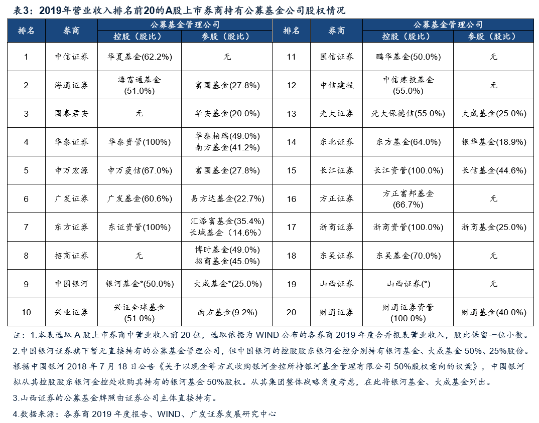 广发证券研究统计,前二十大券商均至少持有1家公募基金管理公司的股权。而前十大券商则共计控股了8家基金公司、参股了10家基金公司,前十大券商平均每家持有2家基金公司股权。而截至2019年末,非货币公募基金规模最大的10家基金公司中有7家券商系公募,这7家公募基金公司均有前十大头部券商作为其主要股东。