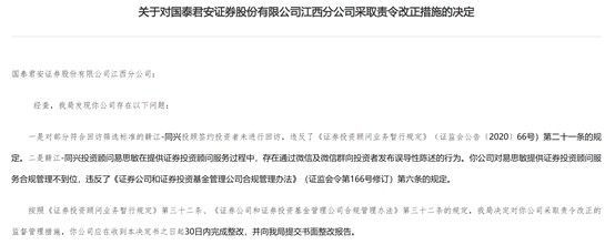 因两项违规,江西证监局责令国泰君安江西分公司改正,整改期限为30天。