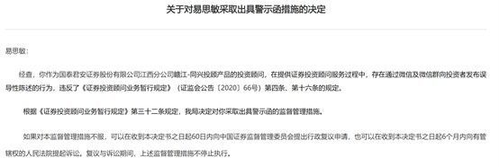 2月18日,江西证监局对任职于国泰君安江西分公司的易思敏下发监管函。原因是当事人身为担任赣江-同兴投顾产品的投资顾问,在提供证券投资顾问服务过程中,存在通过微信及微信群向投资者发布误导性陈述的行为。依据《证券投资顾问业务暂行规定》(证监会公告〔2020〕66号)的规定,江西证监局对其采取出具警示函的监管措施。
