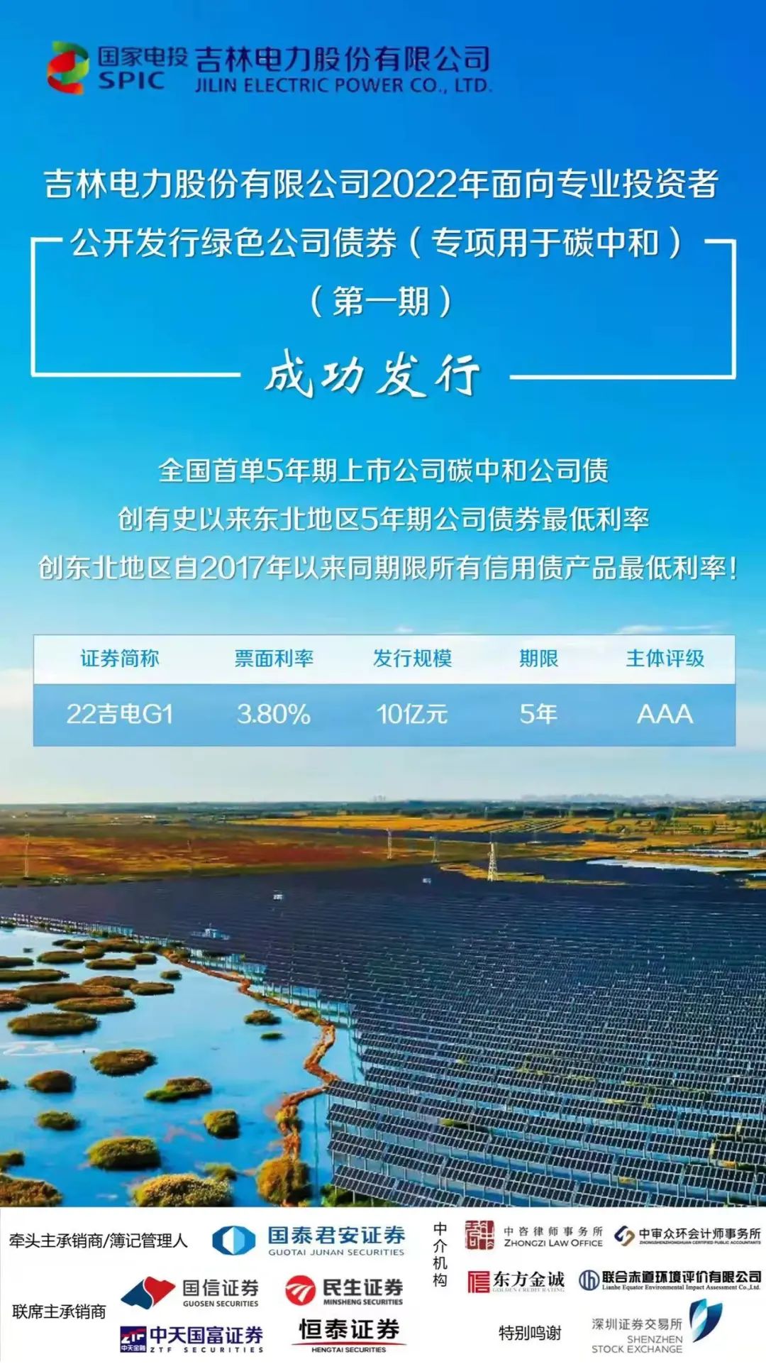 3月16日,国泰君安作为牵头主承销商和簿记管理人,协助吉林电力股份有限公司(以下简称“吉电股份”或“发行人”)成功簿记发行了吉林电力股份有限公司2022年面向专业投资者公开发行绿色公司债券(专项用于碳中和)(第一期)。本期债券最终票面利率3.80%、发行规模10亿元,为全国首单5年期上市公司碳中和公司债、创有史以来东北地区5年期公司债券最低利率、创东北地区自2017年以来同期限所有信用债产品最低利率!