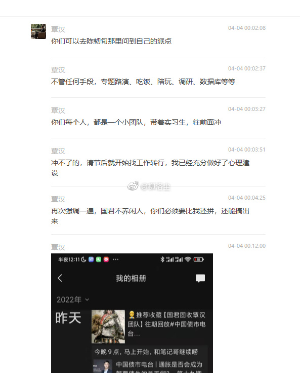 今日晚间,社交平台有网友发文:“国泰君安固收首席分析师覃汉,清明节隔空交战,点名骂了张继强(疑似华泰证券研究所副所长),刘郁(疑似广发固收首席)。还提到了国盛赵增辉。”