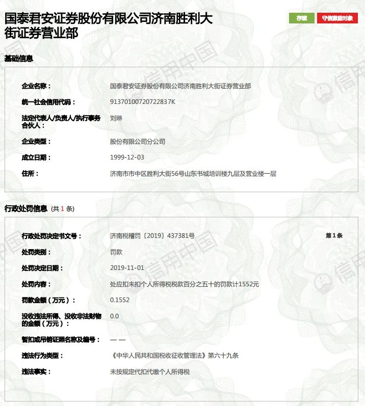 而国泰君安济南胜利大街证券营业部,因“未按规定代扣代缴个人所得税”,被处以处应扣未扣个人所得税税款百分之五十的罚款,计1,552元。