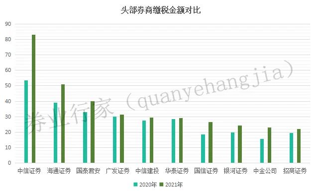 以“营业税金及附加”及“所得税”项合并计算,国泰君安2021年缴税40.00亿元,逊于中信证券和海通证券,在头部券商中排名第三;华泰证券缴税29.12亿元,在头部券商中排名第六。