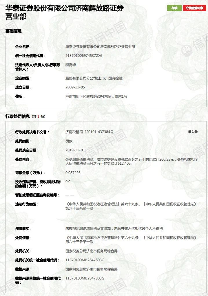 其中,华泰证券济南解放路证券营业部因两项违规被罚,一是未按规定缴纳增值税及其附加,二是未合并收入代扣代缴个人所得税。