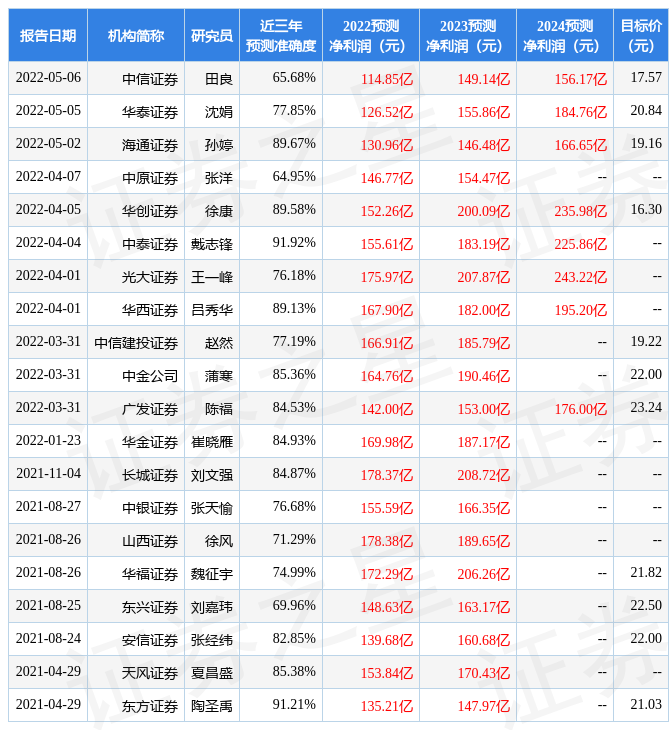 证券之星数据中心根据近三年发布的研报数据计算,中泰证券戴志锋研究员团队对该股研究较为深入,近三年预测准确度均值高达91.92%,其预测2022年度归属净利润为盈利155.61亿,根据现价换算的预测PE为8.05。