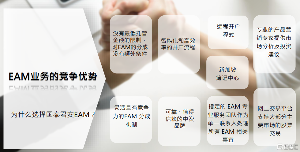 近年来,外部资产管理业务(EAM)在亚洲蓬勃发展,在诸多中资财富管理公司中,国泰君安国际已成为中资外部资产管理服务市场上的领头羊,并拥有成熟且高效的EAM服务平台,具有极具竞争力的分成机制、无最低托管金额限制、国际化簿记中心(新加坡)与智能化高效开户,打造了强有力的金融服务生态和平台。