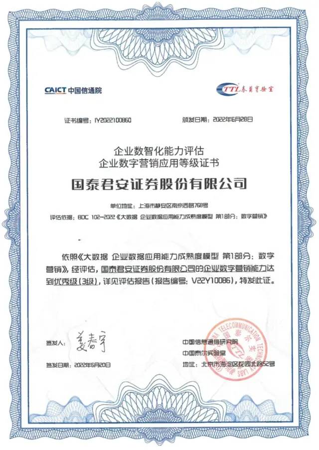 “2022大数据产业峰会”于近日颁发了EDMM-企业数字营销能力首批评估证书。国泰君安成为国内首家获评企业数智化能力成熟度体系(EDMM)-企业数字营销能力优秀级(3级)的证券公司,数字营销能力达到国内最高评级水平。