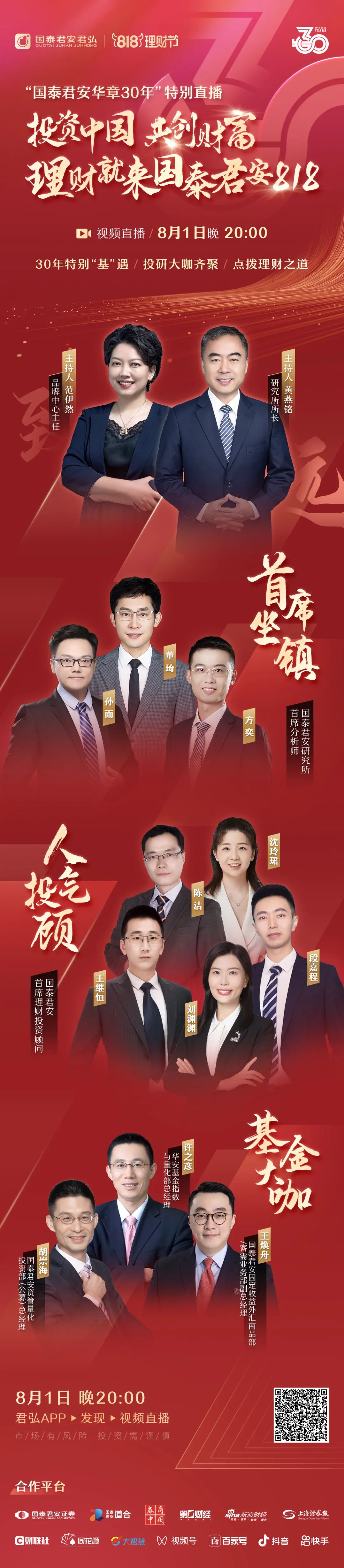 2022年恰逢国泰君安华章30年,君弘App将于8月1日晚8点推出特别直播。国泰君安国泰君安研究所所长携首席投顾、首席分析师,投研大咖齐聚,点拨理财之道,为投资者解读未来海外经济及中国经济的表现,带来下半年投资理财策略。