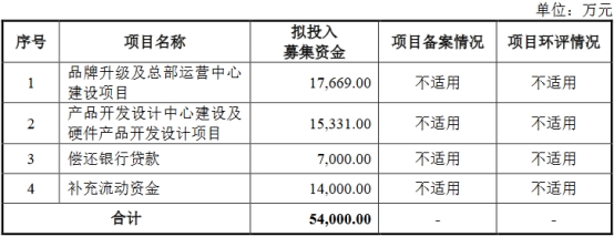 雷神科技拟募集资金54,000.00万元,拟分别用于品牌升级及总部运营中心建设项目、产品开发设计中心建设及硬件产品开发设计项目、偿还银行贷款和补充流动资金。