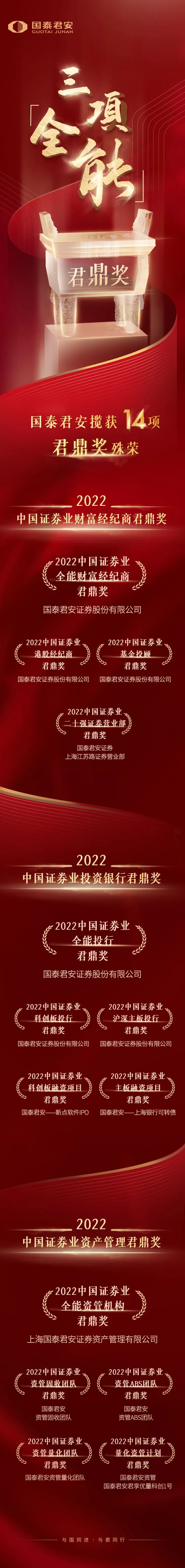 近日,由证券时报·券商中国主办的2022年中国证券业君鼎奖系列评选结果揭晓,国泰君安凭借在财富管理、投资银行、资产管理领域的卓越表现,荣获“2022中国证券业全能财富经纪商”、“2022中国证券业全能投行”、“2022中国证券业全能资管机构”等14项大奖。