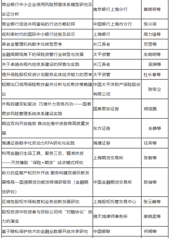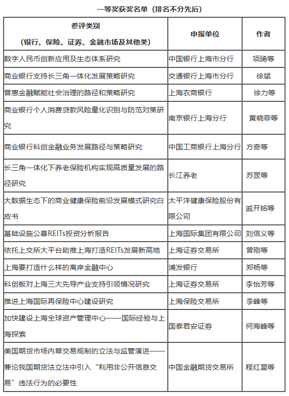 12月15日,由上海金融业联合会主办的“2020-2021年上海金融业改革发展优秀研究成果评选”活动结果正式公布。国泰君安荣获1项一等奖、1项二等奖、2项三等奖,并成为本次评选中唯一获得一等奖的证券公司。