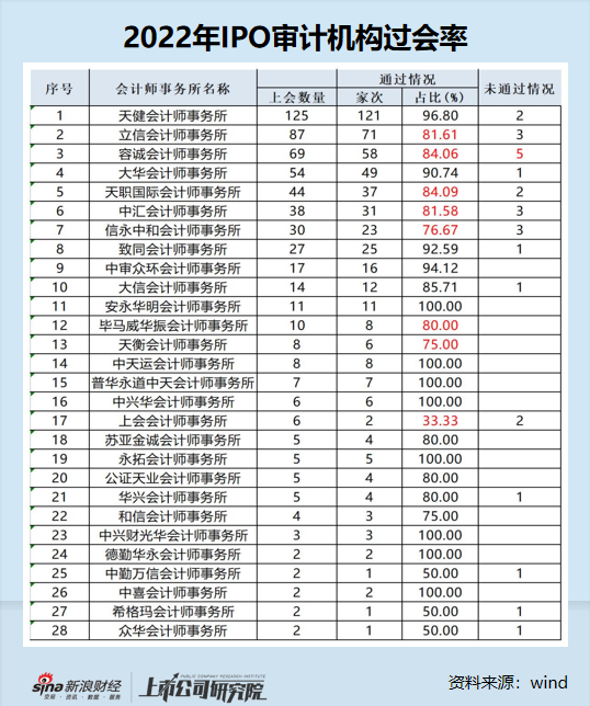 wind显示,2022年IPO项目过会最多的会计师事务所是天健会计师事务所,上会125家,过会121家,过会率为96.8%。