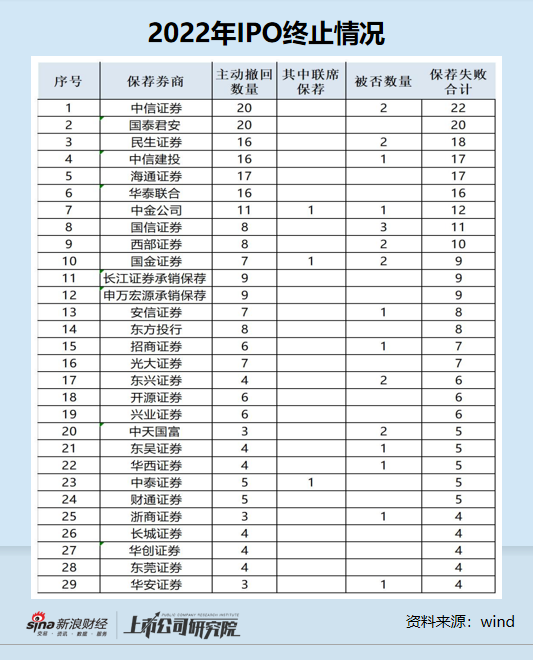 在所有保荐券商中,国泰君安和中信证券撤回数量最多,都是20家。此外,中信证券还有2家项目被否,成为2022年A股IPO失败项目最多的保荐券商。