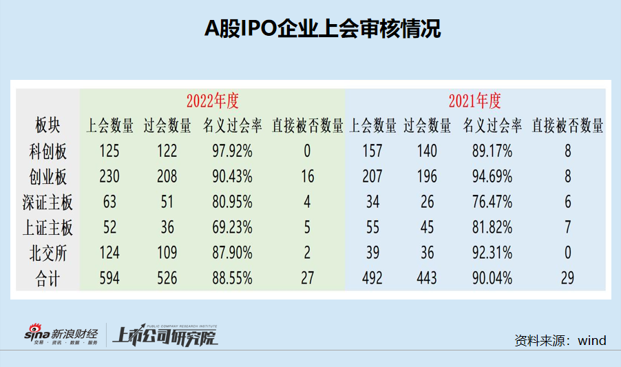 显示,在刚刚过去的2022年,A股市场共有594家企业上会(含二次上会,下同),比2021年增加102次;2022年过会526家,名义过会率为88.55%,比2021年的90.04%略有下降。