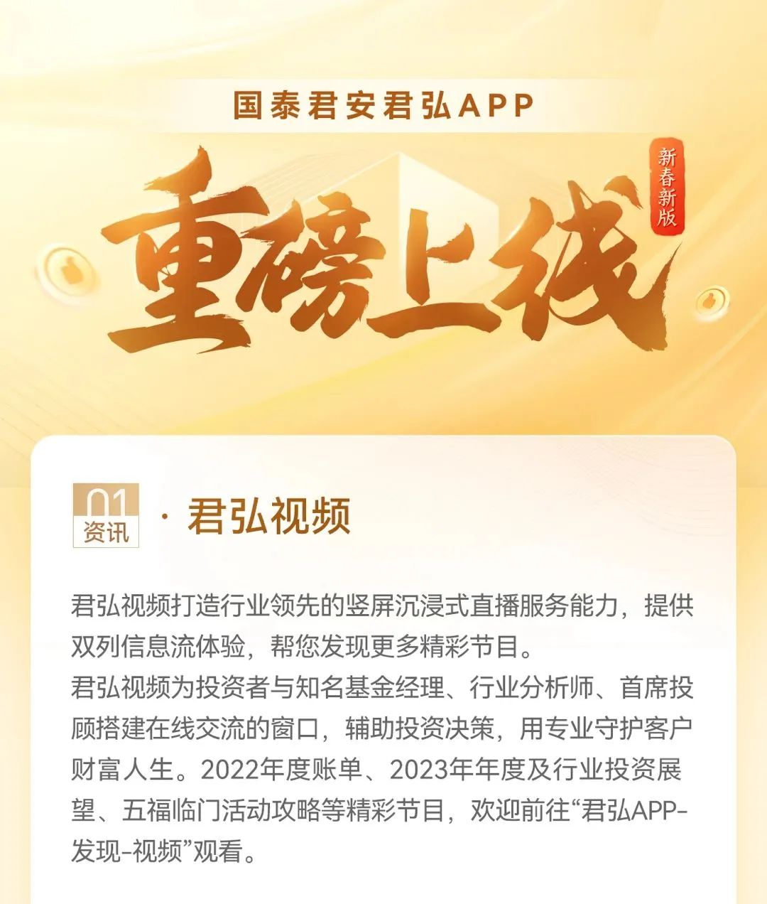 在兔年春节来临之际,国泰君安重磅推出君弘App新春新版本,提供“好产品、好投顾、好服务”,通过智能资讯、智能投资、智能理财三大核心内容的旅程式、智能化服务体系,助力投资者新年投资开门红。