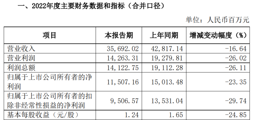 公告显示,2022年国泰君安实现营业收入356.92亿元,同比减少了16.64%;净利润为115.07亿元,同比减少了23.35%;基本每股收益为1.24元,同比减少了24.85%。