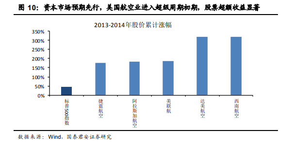 资本市场预期先行,2013-14年美国航空业盈利中枢开始上行,美国航空股便完成最大幅度股价上涨。2013-14年美国标普500指数上涨44%,而美国主要航司股价两年内大涨达2.8倍,超额收益显著。