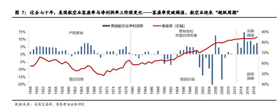 深度探究美国航空“超级周期”成因,国君发现,“客座率突破阈值”是超级周期形成的关键。