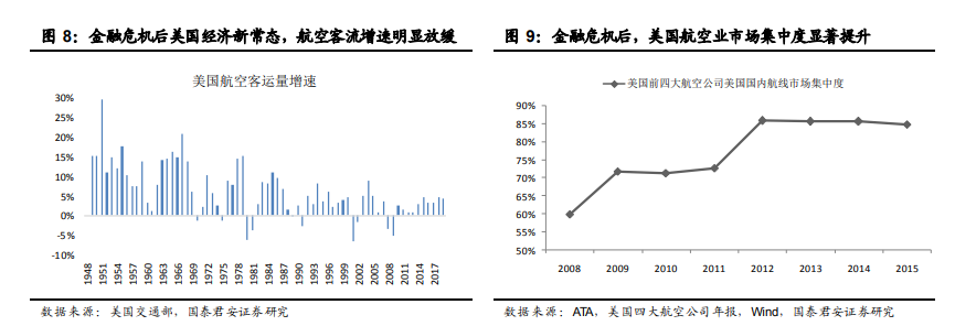 虽处于金融危机后的经济新常态下,美国航空业客座率却因此得以稳步提升,并最终突破阈值,而迎来美国航空“超级周期”。
