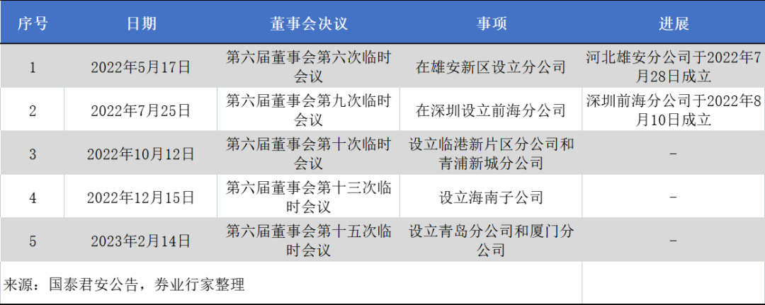 自2022年以来,国泰君安董事会相继通过决议,拟在深圳设立前海分公司,在河北设立雄安分公司,在上海设立临港新片区分公司和青浦新城分公司,以及设立海南子公司。