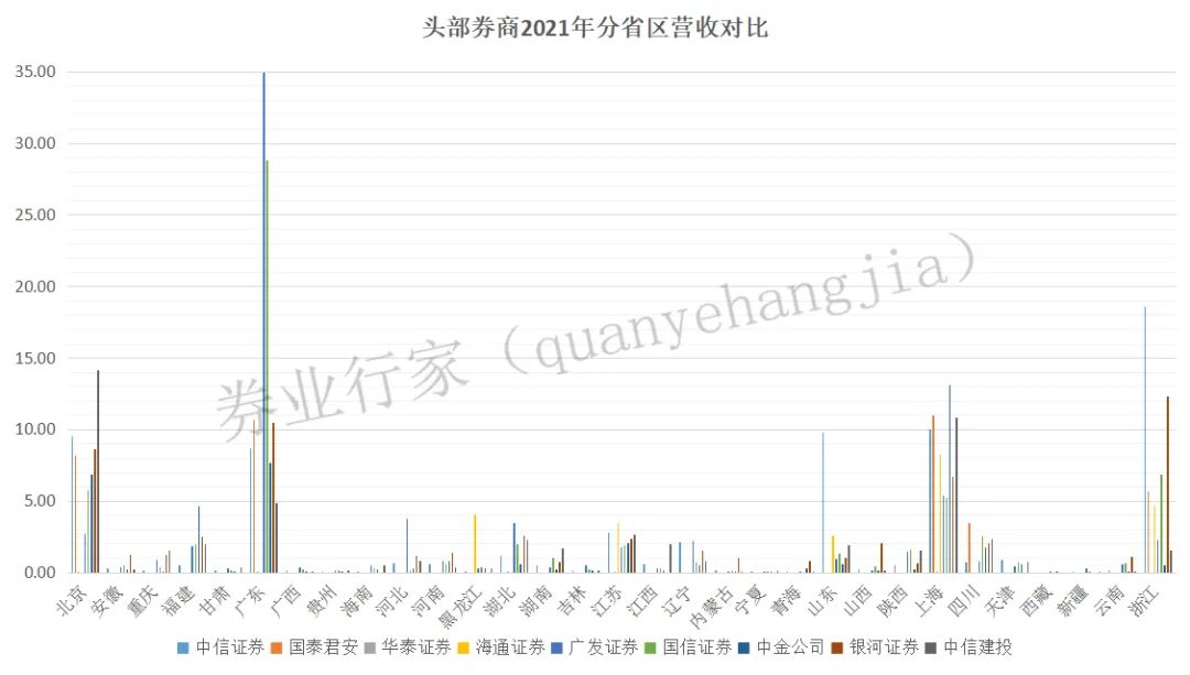 从分地区营业收入来看,广发证券在广东傲视群雄,中信证券在浙江和山东一枝独秀,中信建投在北京表现突出,中金公司在上海略胜一筹。