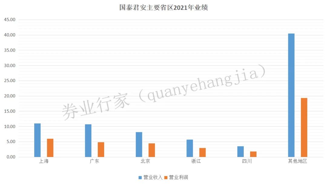 据2021年报,国泰君安在上海、广东、北京、浙江和四川地区的营业收入几乎相当于其余地区之和,营业利润更是超过其余地区。其中,上海和广东两地营收分别为10.97和10.72亿元,北京为8.20亿元;上海地区营业利润5.95亿元,广东和北京分别为4.81和4.47亿元。
