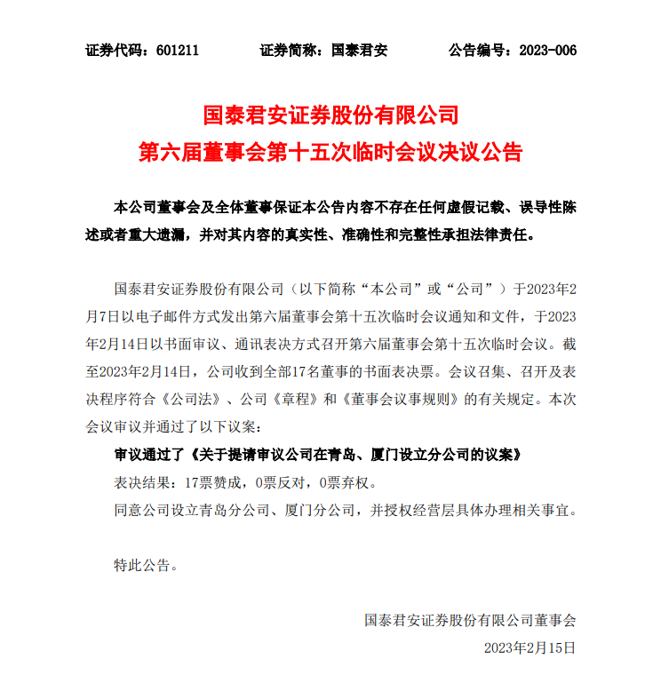 在行家报道《佳话,沪甬两地券商签下战略合作协议》一文后,国泰君安又有走出去的举动。2月15日,国泰君安第六届董事会第十五次临时会议通过决议,拟新设青岛分公司和厦门分公司。