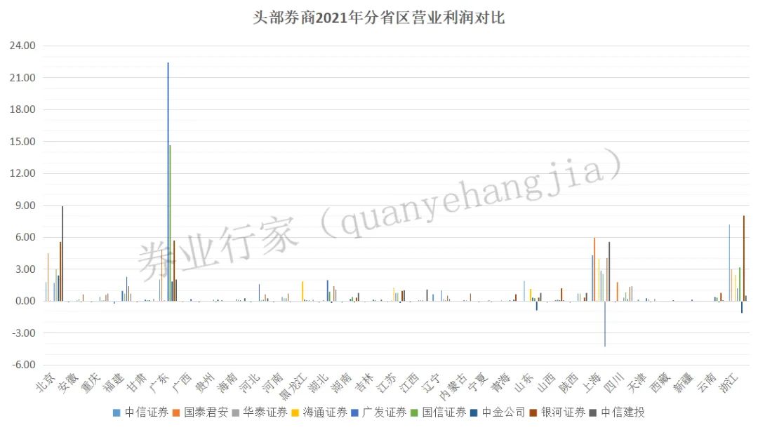 为进行横向比较,行家翻查了头部券商2021年报:招商证券仅列出了境内和境外数据,申万宏源划分了四大区域,其余头部券商或全面覆盖,或重点开花,披露了较为详细的创收和创利数据。